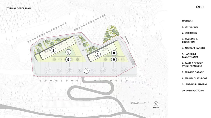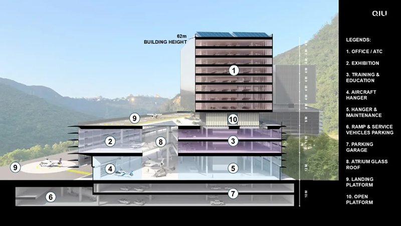 QIU受邀設計的深圳首個載人無人機港,將在未來成為大灣區(qū)低空商務旅行的新總部,兼?zhèn)渚仍行募拔磥黼妱哟怪逼鸾担╡VTOL)測試基地。