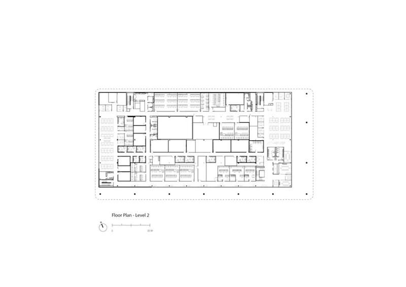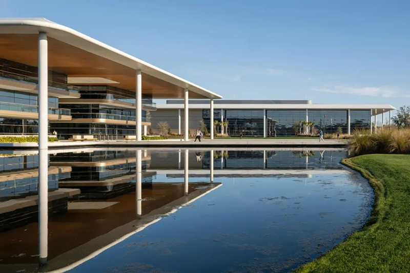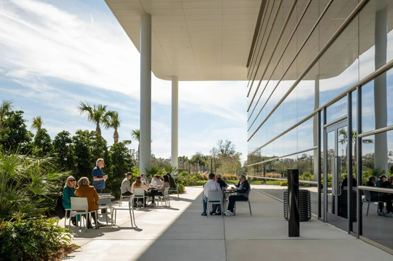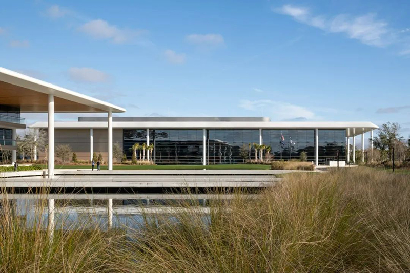 這座新建筑位于TPCSawgrass球員體育場(chǎng)球場(chǎng)南側(cè),緊鄰 PGA巡回賽總部大樓,后者也是由 Foster +Partners 設(shè)計(jì)。建筑采用與總部一致的設(shè)計(jì)語(yǔ)言,南、東立面設(shè)有寬敞的柱廊,大型懸挑屋頂提供遮蔭,同時(shí),玻璃幕墻確保了充足的自然采光,并可眺望水景及周邊園區(qū)。園區(qū)內(nèi)設(shè)有景觀步道連接兩座建筑,方便員工與訪客通行。建筑材料選用白色金屬、混凝土與玻璃,以保持整體風(fēng)格的協(xié)調(diào)統(tǒng)一。