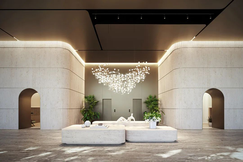 居民將享受超過7432平方米的專屬設施空間,分布在大樓的頂部三層。66層的健康俱樂部設有929平方米的水療和健身區(qū)域,包括Technogym設備、重量訓練室、HIIT區(qū)域、瑜伽室、冥想室和美容套房。 67層的業(yè)主俱樂部提供雙層高的葡萄酒和烈酒休息室、私人餐廳、辦公套房和會議室。 70層的屋頂觀景臺設有成人專屬泳池、雙層高中庭休息室和天空酒吧,居民可在850英尺的高空享受壯麗景色。